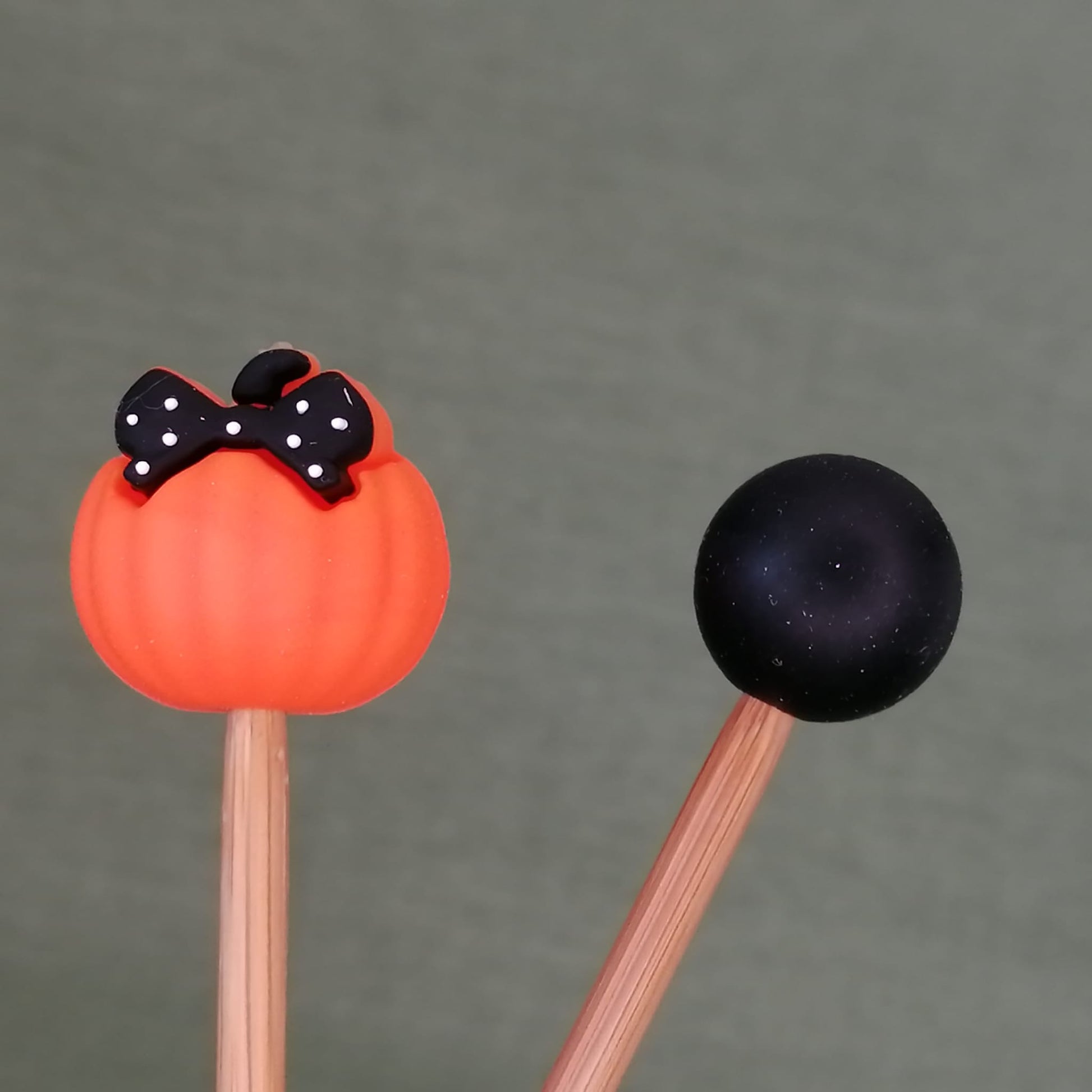 Contains 2 sets of silicone needle stoppers, one set consists of a pumpkin and a 'boo' gnome, the other set are black spherical shape. Designed to fit standard knitting needles.